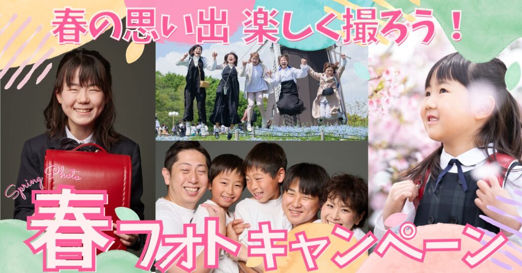 5月末までの春フォトキャンペーンとして、ベーシック(スタジオ撮影)プランとロケプランにお申込みいただいたみなさまに、プリントを2枚プレゼント、ライトプランとプロフィール撮影プランをお申込みいただいたみなさまには納品データを通常+1点追加いたします。